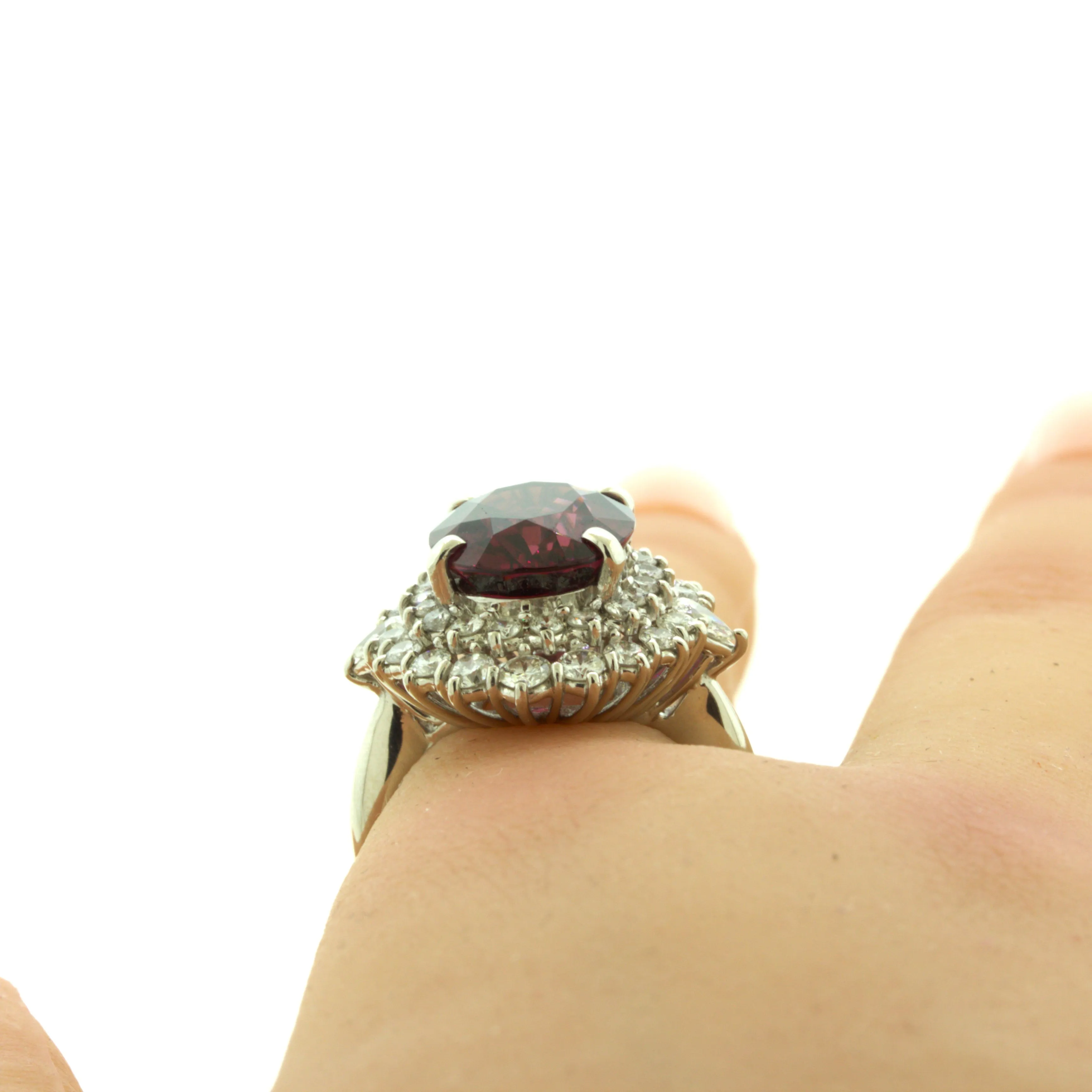 A super gem garnet, rhodolite variety, takes center stage! It weighs an impressive 8.16 carat and has an intense rich red color with secondary purple color making the stone glow. It is complemented by 1.58 carats of round brilliant-cut diamonds which make a double halo around the gem, along with two pear-shape diamonds on each side of the ring. Hand-fabricated in platinum, a super fine gem at an affordable price ready to be worn.